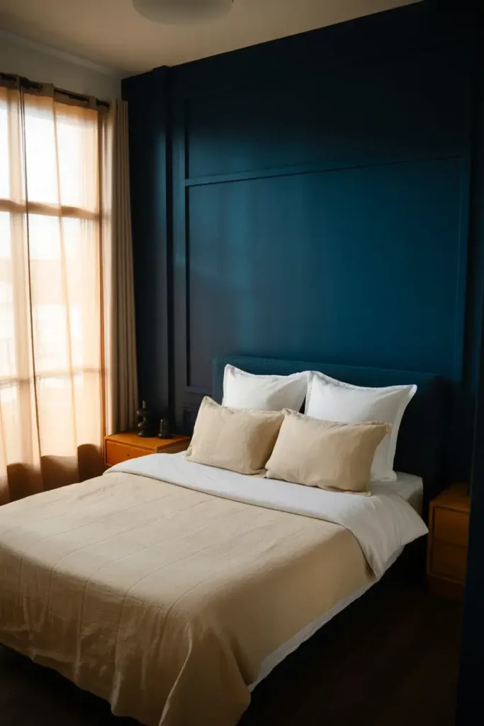 I love using a deep, rich color on the wall behind the bed. While many people fear dark colors in small spaces, a deep navy, charcoal, or forest green actually recedes visually.