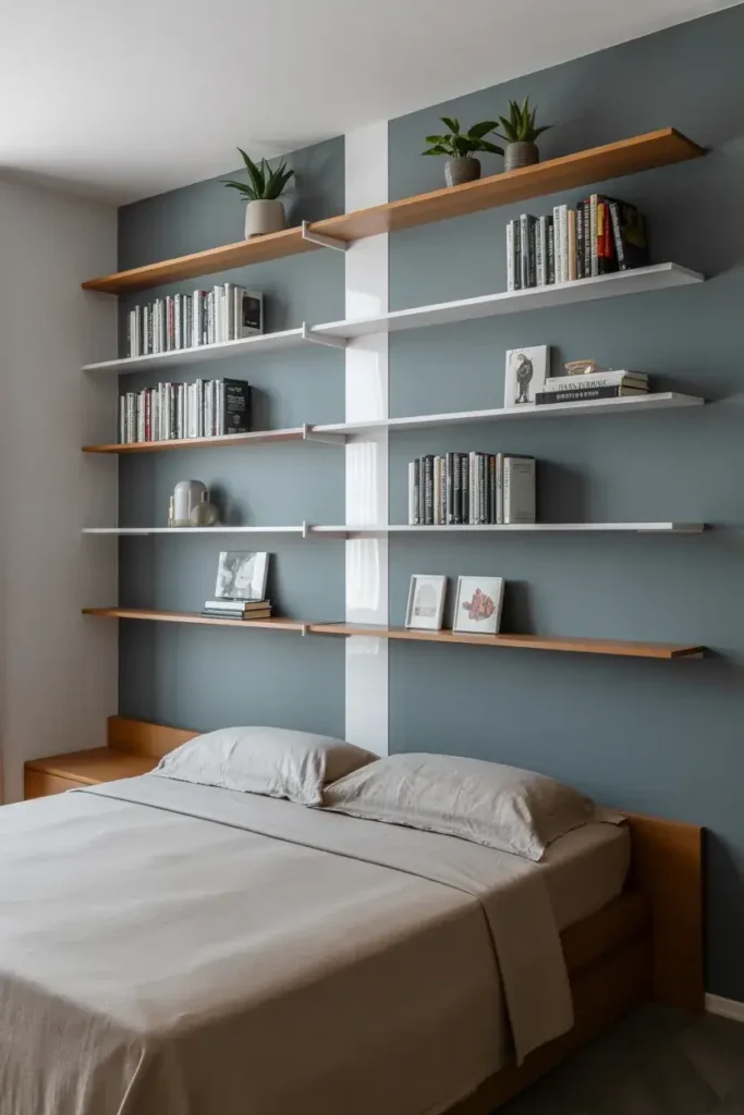 When floor space is at a premium, I go vertical with storage. Installing floating shelves as an accent wall provides a place for books, plants, and art without a bulky bookcase.