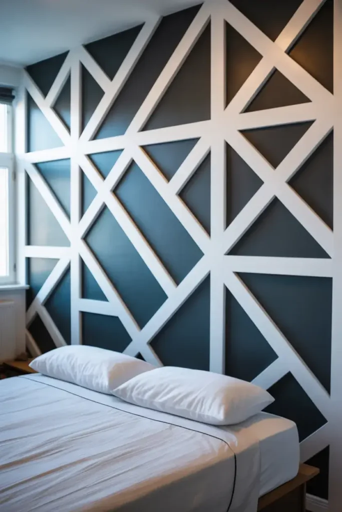 For a modern and edgy look, I use painter’s tape to create geometric shapes. You simply tape off a design—triangles, diamonds, or abstract lines—and paint over the wall.