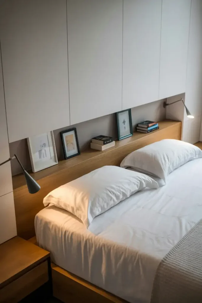 This eliminates the need for nightstands if your room is extremely narrow. It streamlines the furniture layout and keeps all your essentials within arm’s reach.