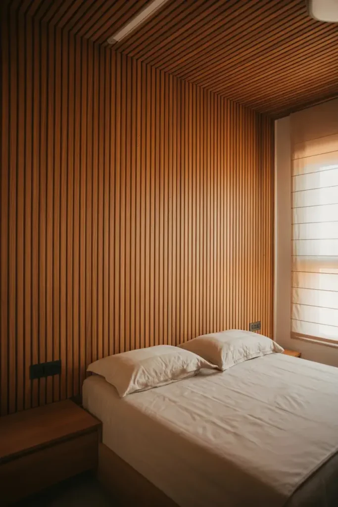If your ceilings feel low, vertical wood slats are my secret weapon. By installing thin wooden strips from floor to ceiling, I guide the eye upward, instantly emphasizing the vertical height of the room.