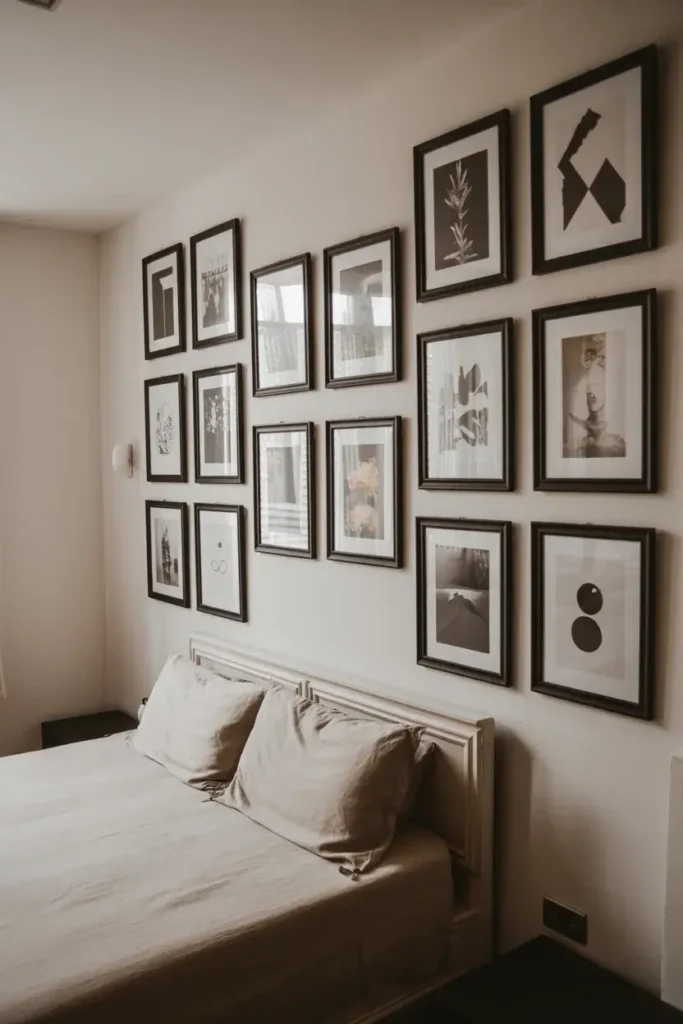 A gallery wall allows you to display your personality without cluttering surfaces. I prefer using matching frames for a cohesive look in small spaces to avoid visual chaos.