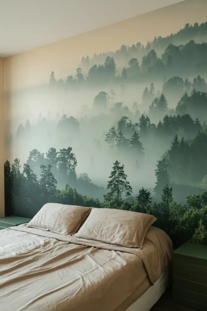 Scenic murals transport you to another place entirely. I recommend landscape murals like misty forests or clouds for small bedrooms because they blur the boundaries of the wall.