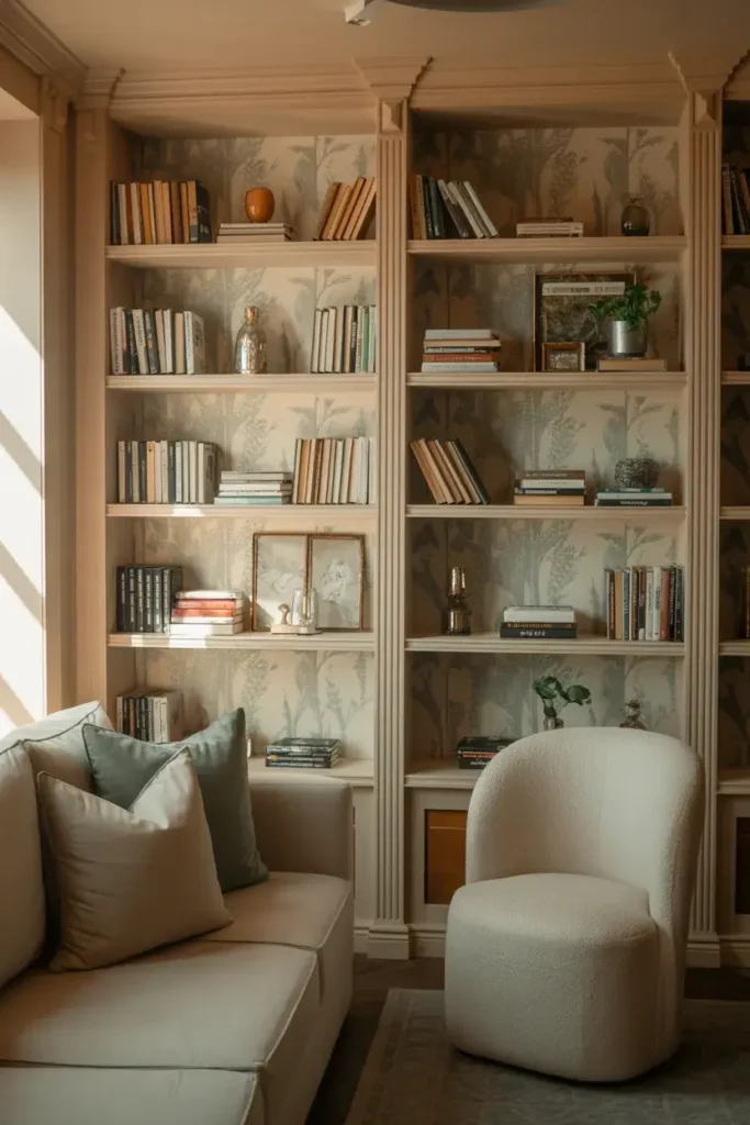 I love this trick for a subtle pop of color. Applying wallpaper to the back of built-in shelves adds depth to your display.