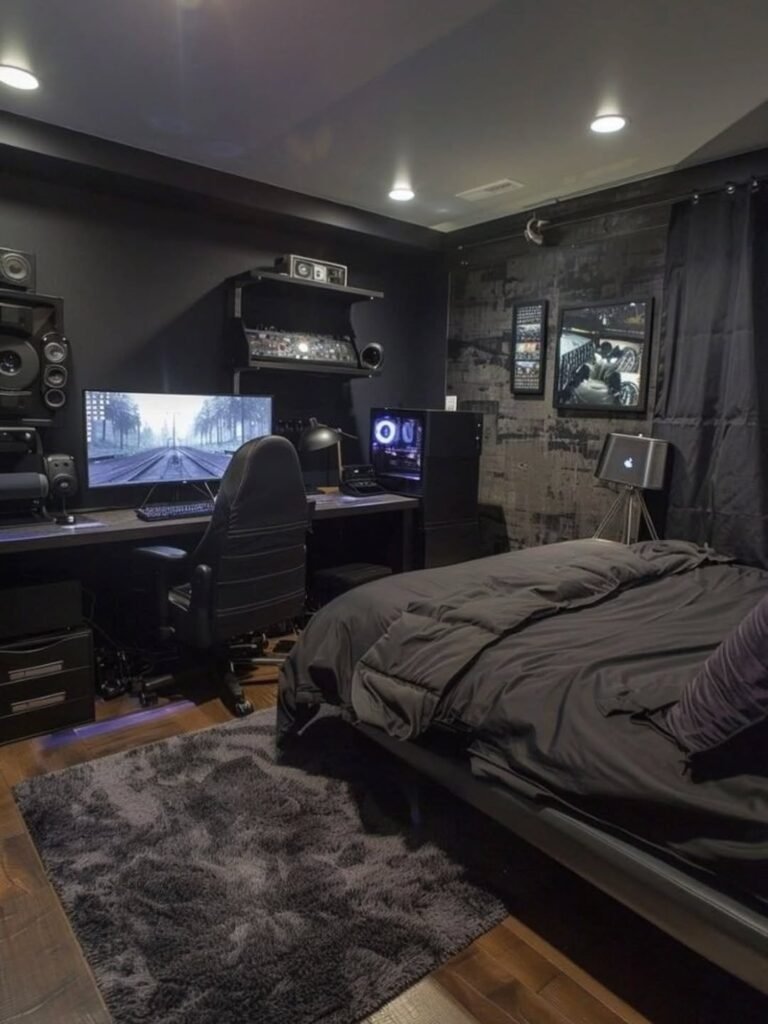 I enter this gaming bedroom and the dark brick wall pulls me right in. Two big monitors sit ready on the desk while large speakers stand guard on both sides. The black bed looks cozy after long gaming nights.