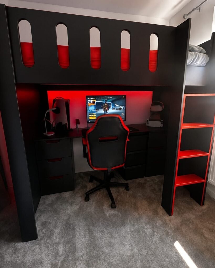 This gaming bedroom saves floor space and still feels huge for playtime. I game for hours and then climb straight up to sleep. Boys love the bold black and red combo that makes every session exciting.