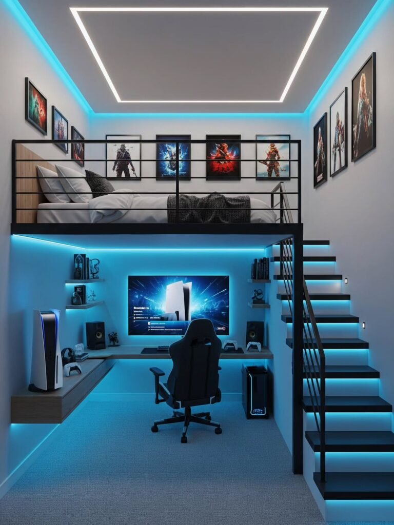 I climb the glowing stairs in this gaming bedroom and reach the loft bed in seconds. Blue LED strips run along every edge while gaming posters line the railing like a private gallery. The desk below holds a huge monitor and PlayStation ready to go.