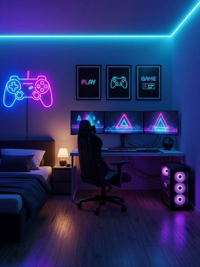 I enter this gaming bedroom and the giant neon controller sign instantly grabs my attention. Three wide monitors show glowing triangles while purple and blue LEDs wrap the ceiling and desk. The racing chair sits ready with headphones hanging close by.