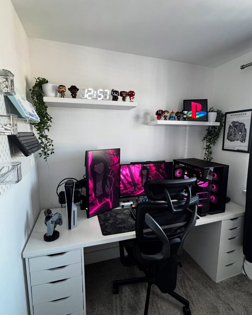 I sit at this white desk and the pink neon screens make my gaming bedroom feel like a secret anime world. Dual monitors show a girl with glowing eyes while Funko Pop figures watch from the shelf above. The PlayStation stands ready on the left and the PC pulses with pink lights on the right.