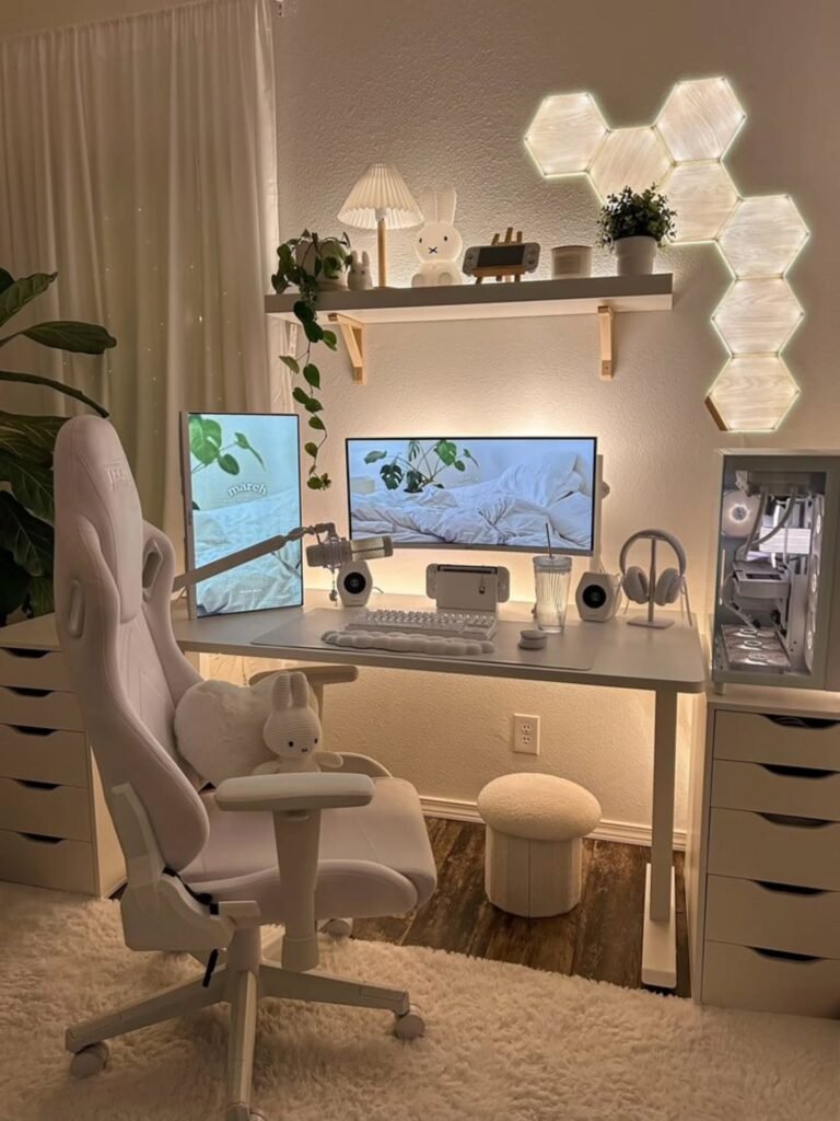 I sink into this white gaming chair and the whole gaming bedroom feels like a warm hug. Two monitors glow with gentle green scenes while wooden hexagon lights shine softly above the desk. A tiny Miffy bunny sits on the shelf and keeps me company during every match.