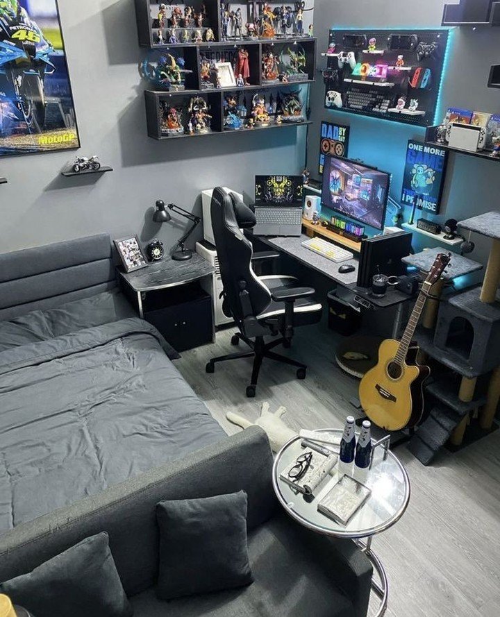 I look up at the wall shelves in this gaming bedroom and count dozens of cool action figures staring back. Blue LED strips light up the gaming desk while the acoustic guitar leans ready for breaks. The gray bed looks soft and inviting after long matches.
