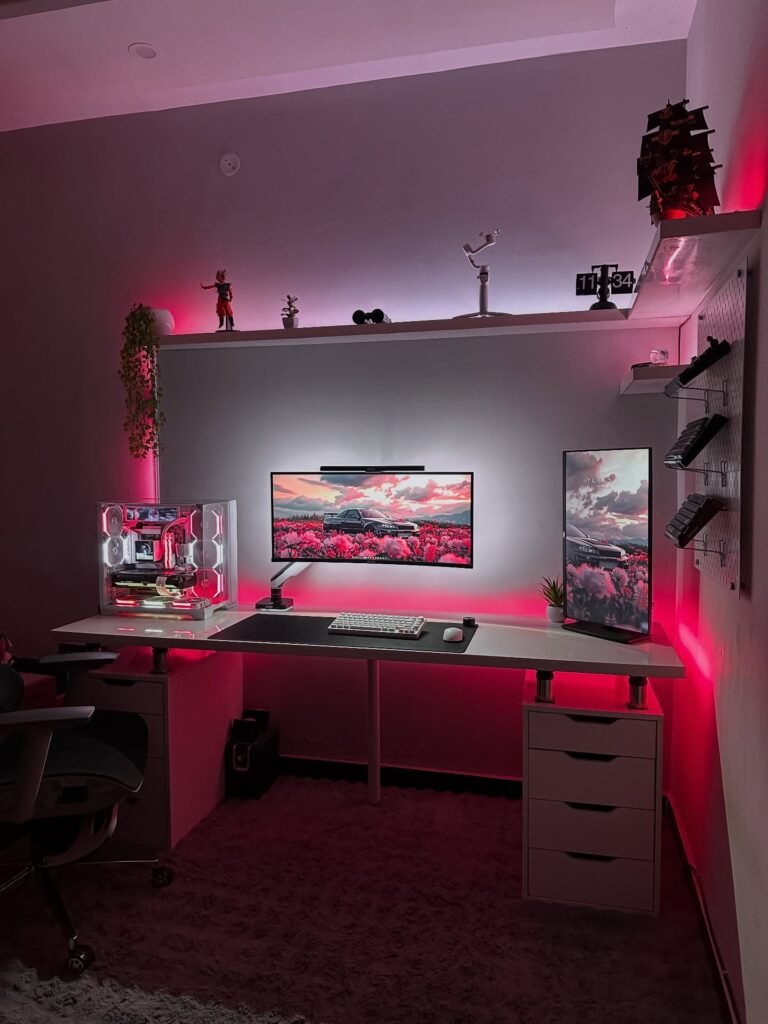 This gaming bedroom proves you can have style and power in one space. I play late into the night and the soft pink light keeps my eyes happy. Boys show this setup to friends and always get big smiles back.
