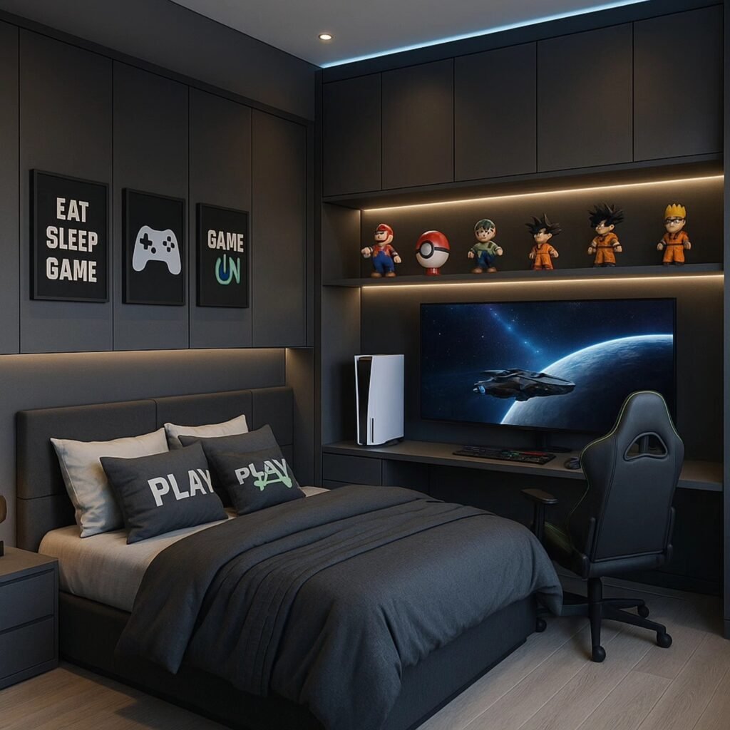 I step into this gaming bedroom and the dark walls pull me straight into the action. Mario, Goku, and Link figures line up on the shelf while the big screen shows a spaceship flying past Earth. Three posters on the wall say exactly what I feel: Eat Sleep Game.