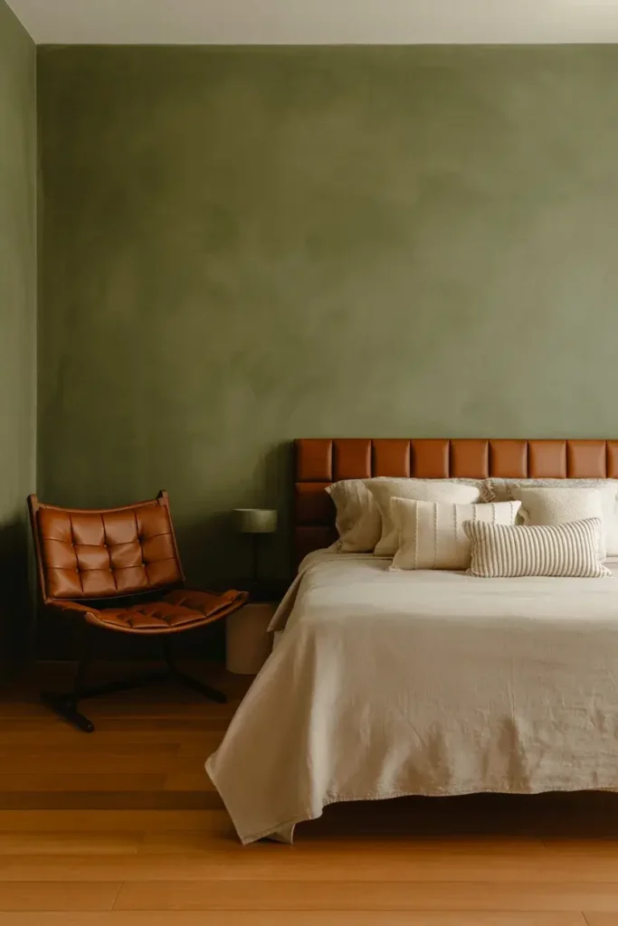 I recommend an olive accent wall for rooms with leather accents or wood flooring. It enhances the richness of natural materials and makes the space feel established and safe.
