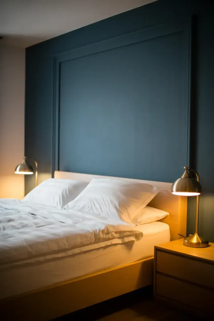 Navy blue is a classic choice that pairs well with metallic accents like gold or brass lamps. It grounds the room and creates a focal point that feels sophisticated yet sleepy.
