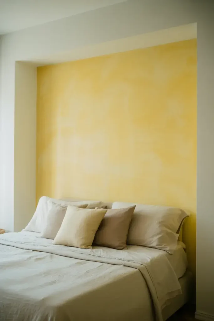 Tip: Keep your bedding white or neutral to let the yellow wall shine without clashing.