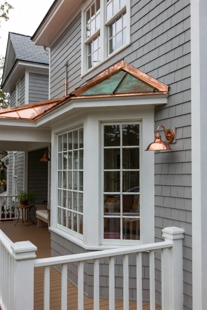 Copper adds a touch of luxury that ages beautifully. I suggest adding a copper roof over a bay window or choosing copper light fixtures.