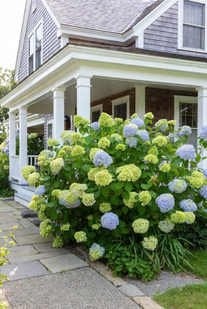 Hydrangeas are the quintessential Cape Cod flower. I love planting “Limelight” or blue hydrangeas right in front of the porch railing.