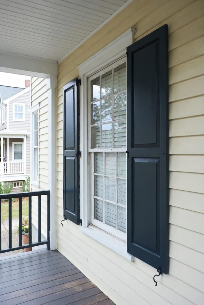 Choose a dark, contrasting color like “Black Forest Green” or a deep navy. Use proper shutter hardware, like “shutter dogs,” to hold them in place for an authentic look.