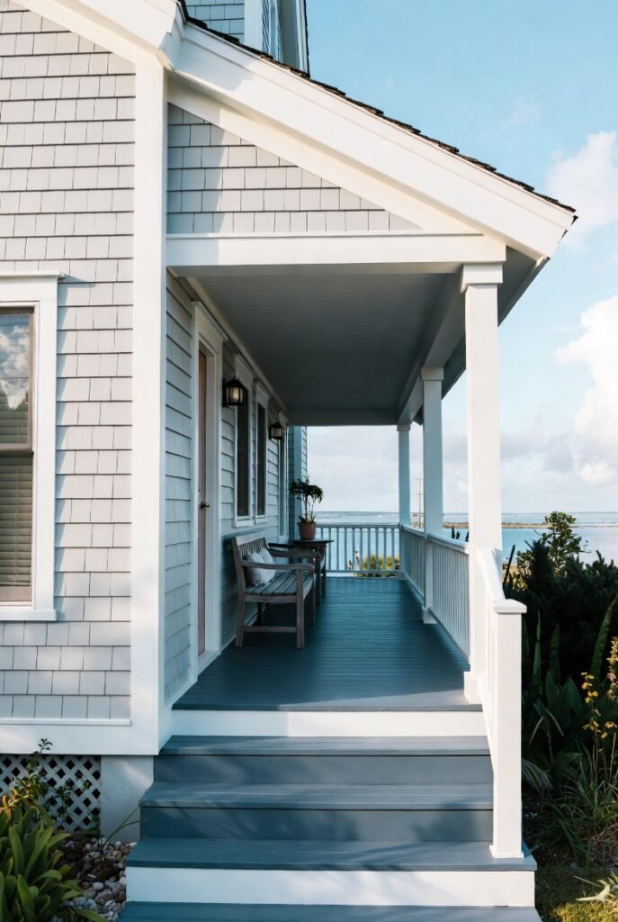 For example, try light gray siding with white trim and a slate blue porch floor. This combination feels serene and timeless, perfectly capturing the coastal vibe.