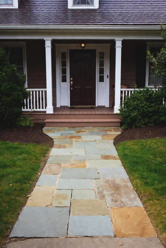 Natural stone looks established and high-end. It guides the eye towards your front door and elevates the entire entrance experience.