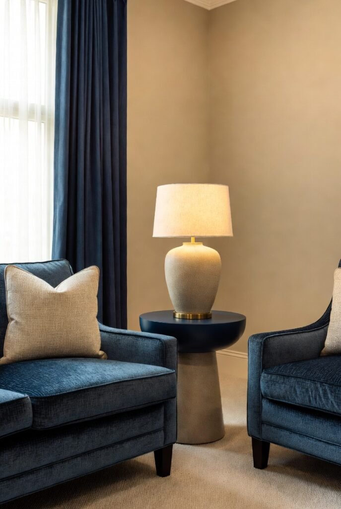 Using beige alongside navy can lighten a space without losing warmth. This pairing works well in living rooms or bedrooms where you want a timeless look.
