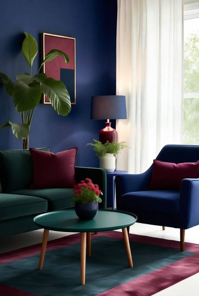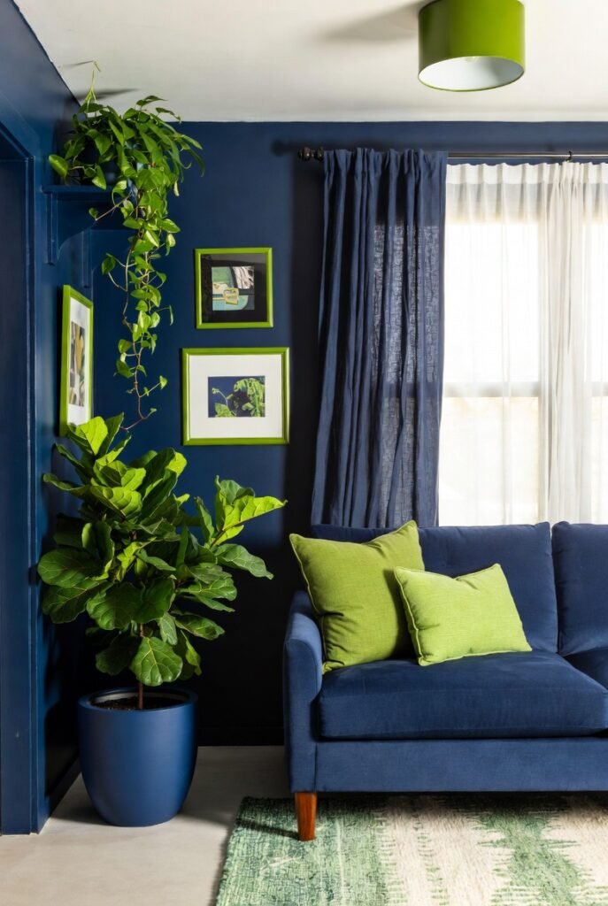 Brighter or jewel-toned greens create contrast and energy without overwhelming the space. Combining navy with green plants or textiles brings freshness and a grounded vibe to any room.