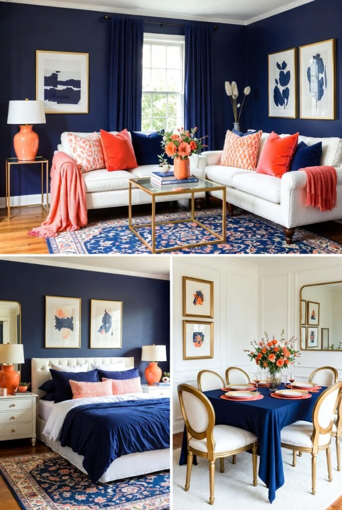 Using navy as the dominant color and coral for accents works particularly well. Think pillows, artwork, or small decorative items to introduce coral.