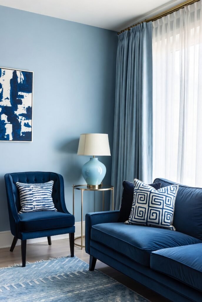 Using light blue alongside navy can brighten a room and bring a subtle freshness. It works well in bedrooms and living areas where a peaceful atmosphere is desired.