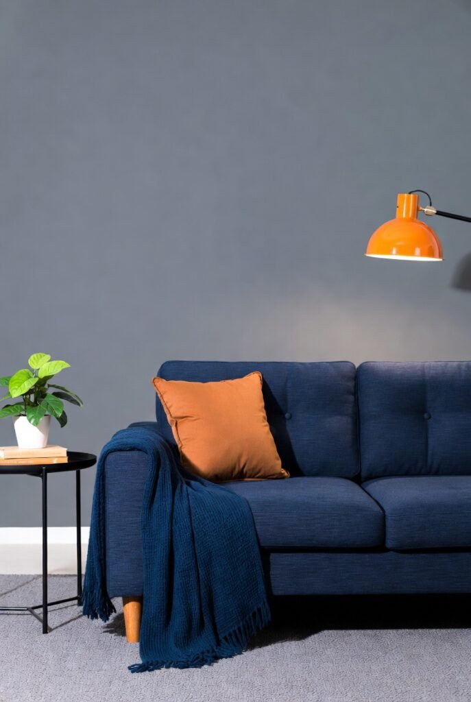 For a more subtle effect, I prefer softer orange tones that complement navy’s depth while keeping the space sophisticated and inviting.
