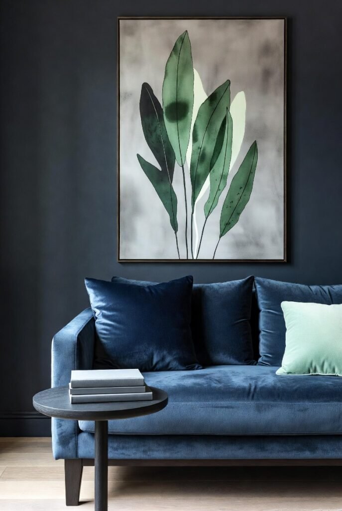 Using black accents like frames or furniture with navy walls or upholstery creates a sleek, cohesive look. This combination works well in living rooms or offices for a polished feel.