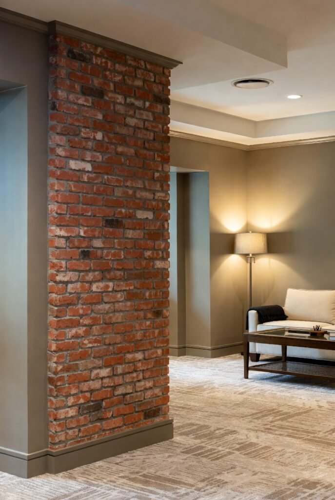 When used in interior design, greige offers a neutral backdrop that balances bold red brick while adding subtle sophistication. It works well on walls, trim, or even furniture.