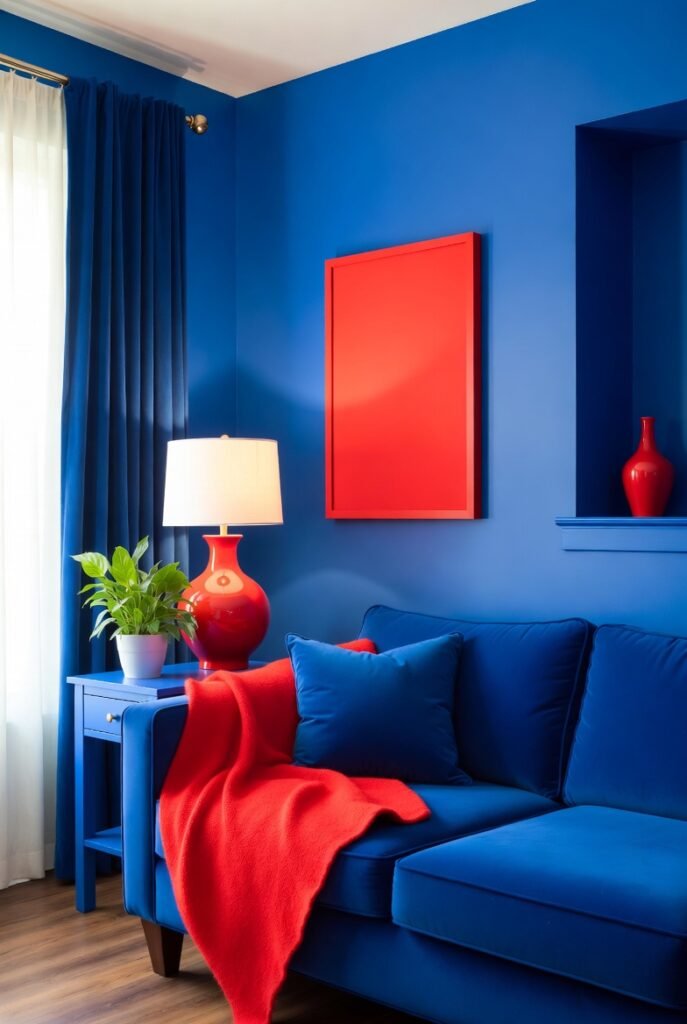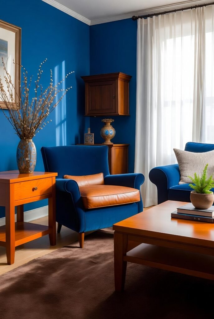You cannot go wrong with natural wood tones. Cognac-colored leather or warm wood furniture grounds royal blue and stops it from feeling too “primary school.” The orange undertones in the wood naturally complement the blue.