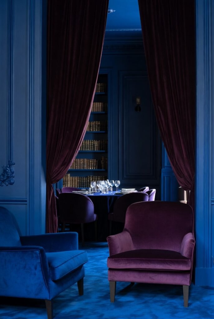 I find this works best in a library or a formal dining room. Use velvet textures in both colors to enhance the feeling of luxury and depth in the space.