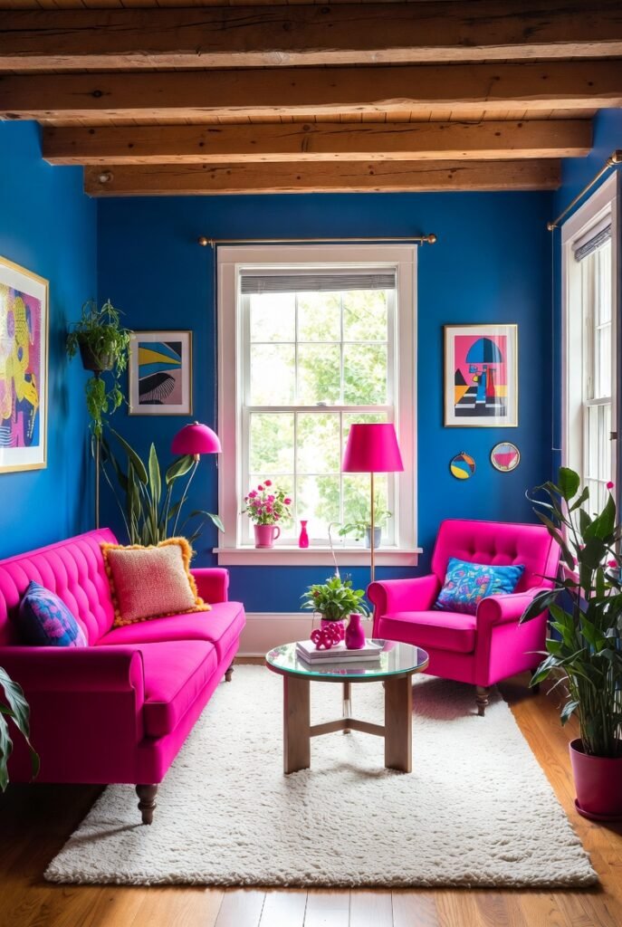 For the maximalists out there, hot pink and royal blue create a vibrant, electric atmosphere. This isn’t for the faint of heart, but I think it looks incredible in creative spaces or eclectic living rooms.