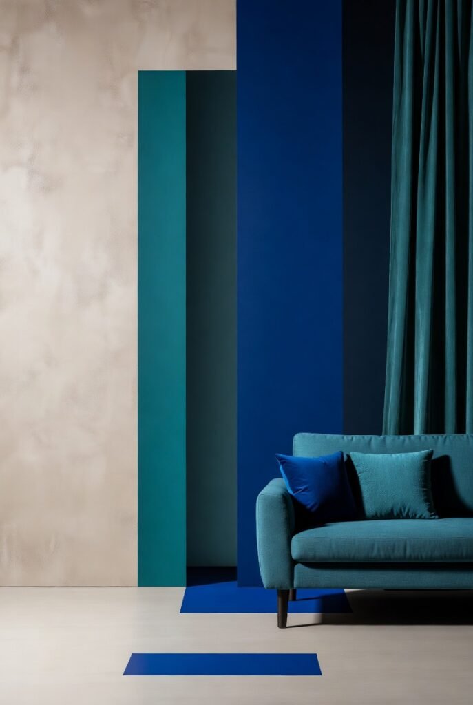 Layering different shades of blue creates a sophisticated, monochromatic look. Teal adds a greenish-blue depth that complements royal blue perfectly. It makes a room feel submerged and moody in the best way possible.