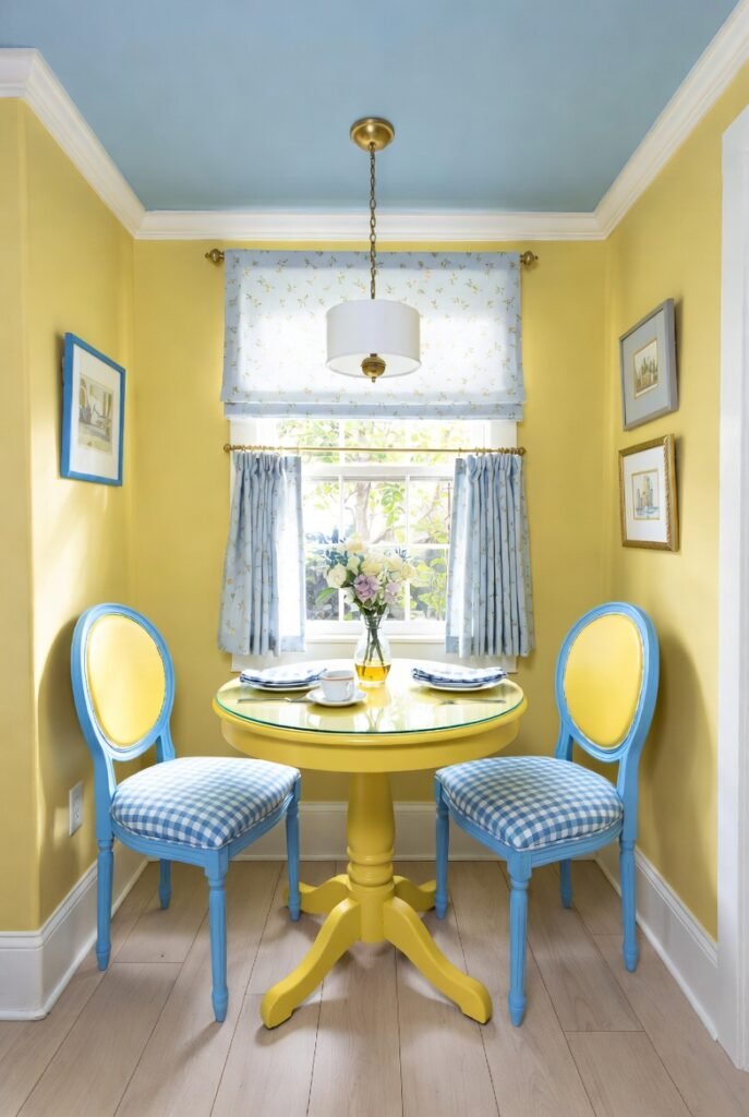 Yellow and sky blue is a cheerful, classic pairing often found in French Country decor. It feels like a summer day and works wonderfully in breakfast nooks.