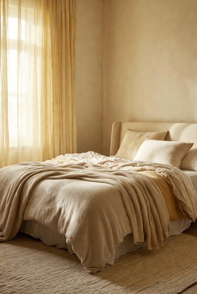 I recommend layering different shades of cream, beige, and soft yellow through throw blankets and rugs. It creates a “hygge” vibe that is incredibly cozy.