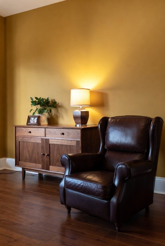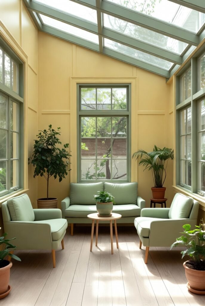 I recommend this pairing for a nursery or a sunroom. A soft yellow wall with sage green furniture creates a calm, organic atmosphere that feels like bringing the outdoors in.