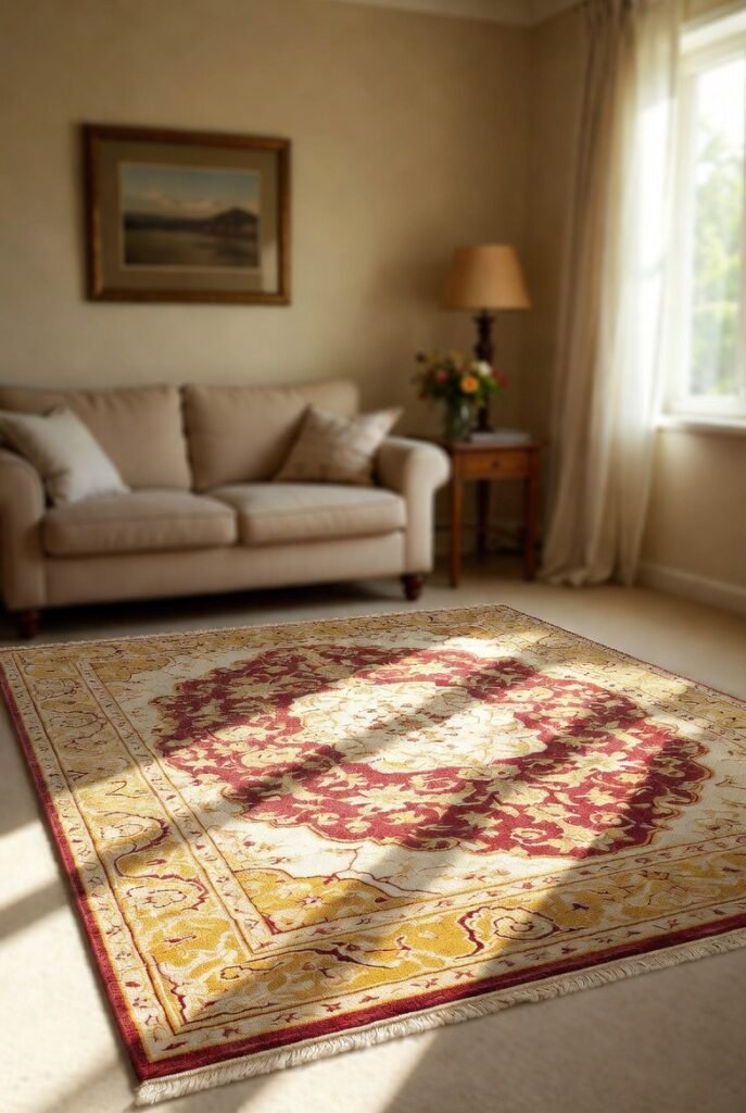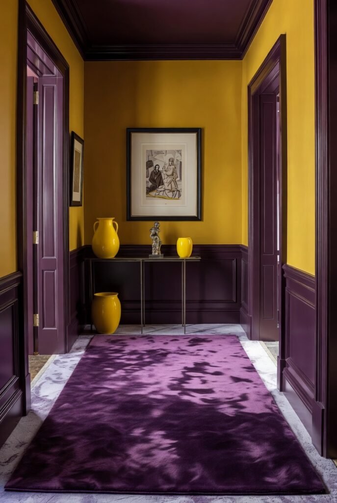 I suggest using this in a formal living room or hallway. A deep purple rug anchors the room, allowing yellow accents to pop vividly against it.