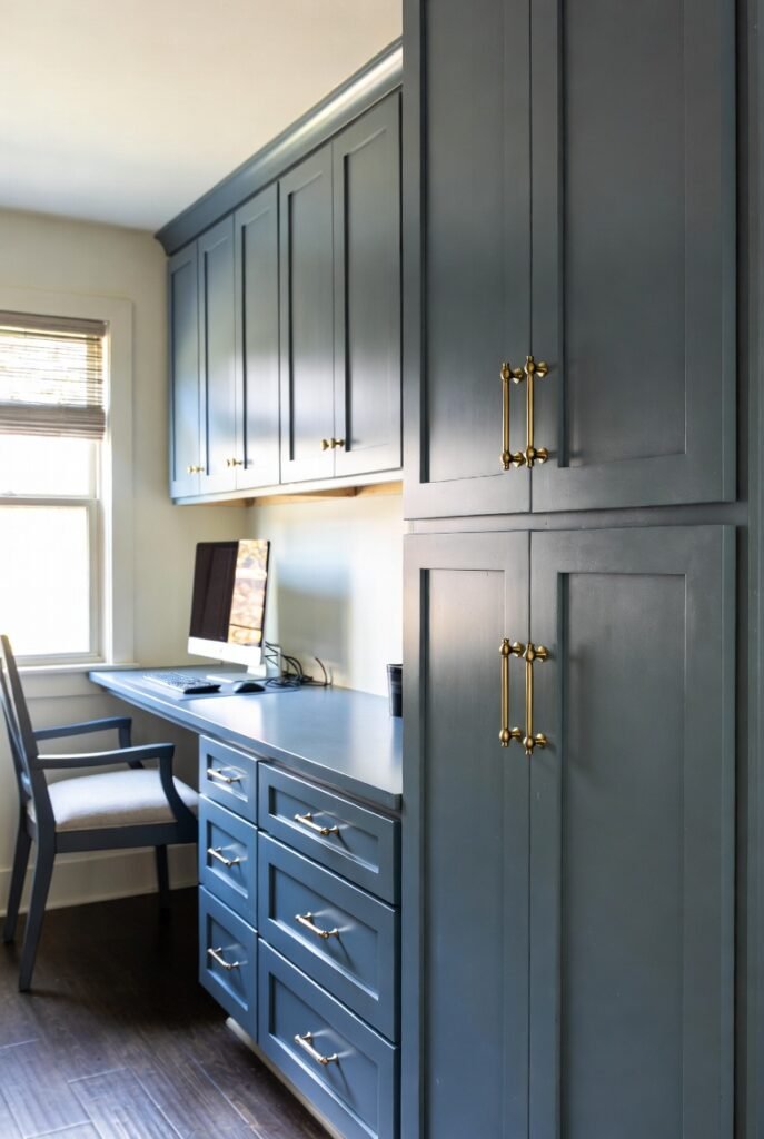 I love this for a home office. Slate blue cabinets with brass (yellow-toned) hardware is a subtle way to nod to this color scheme without it feeling too loud.