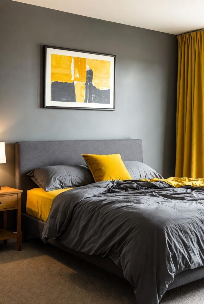 For a sophisticated, modern vibe, you can’t go wrong with charcoal gray. Gray tones down the intensity of yellow, making it livable for larger spaces like living rooms or bedrooms.