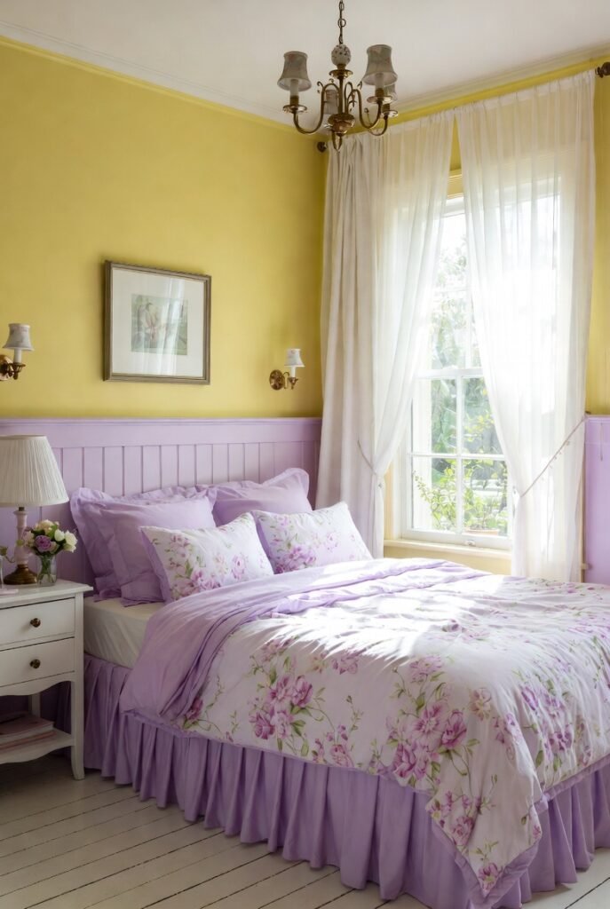To keep it from looking too intense, I stick to pastel shades. A pale primrose yellow paired with soft lavender creates a dreamy, romantic vibe perfect for a cottage-style bedroom.