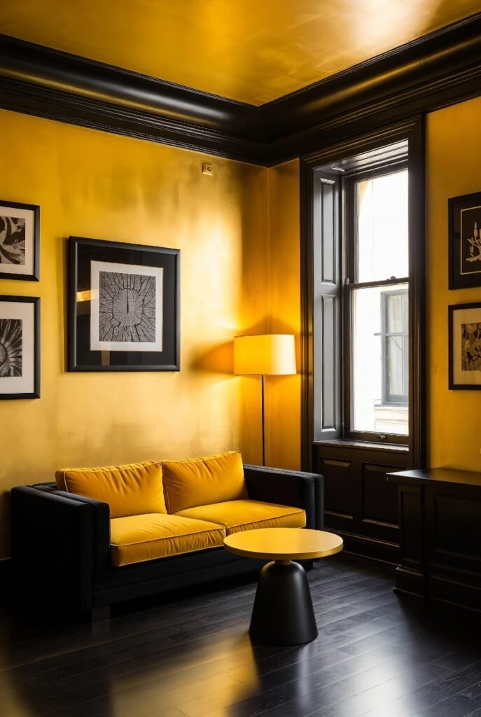 I suggest using black for thin accents—like picture frames, lamp bases, or window trim—against a backdrop of golden yellow walls. It adds definition and sharpness to the space.