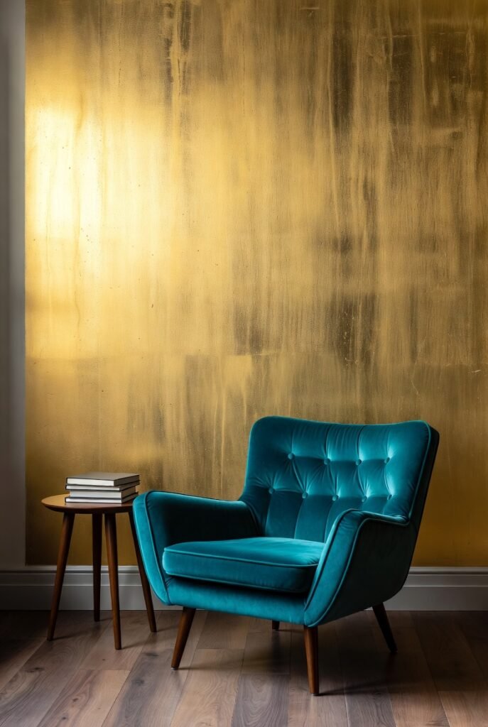 I love placing a teal armchair in front of a gold-painted wall. The cool blue-green tones balance out the heat of the gold, creating a sophisticated library or lounge feel.