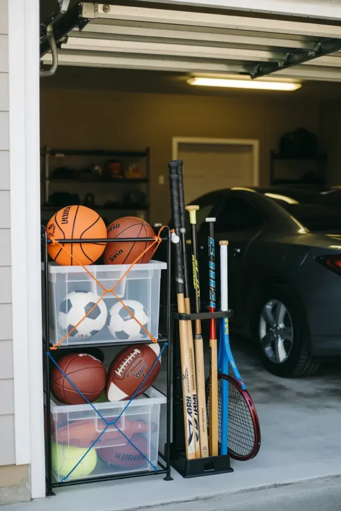 I use bungee cords and tall bins to corral sports gear. A dedicated station prevents basketballs and soccer balls from rolling under the car. I use a vertical bin for bats, hockey sticks, and rackets.