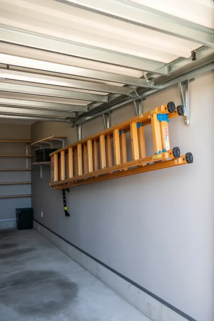 I realized my ladder was taking up too much floor space leaning against the wall. I mounted heavy-duty hooks to hang it horizontally on the wall. You can even hang it high up near the ceiling.