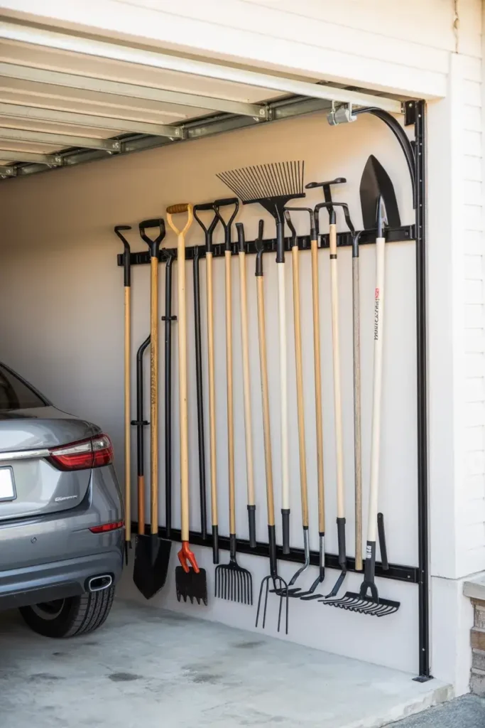 I used to leave rakes and shovels in a pile in the corner. I installed a wall-mounted rack specifically designed for long-handled tools. It snaps the handles into place so they stand up straight.