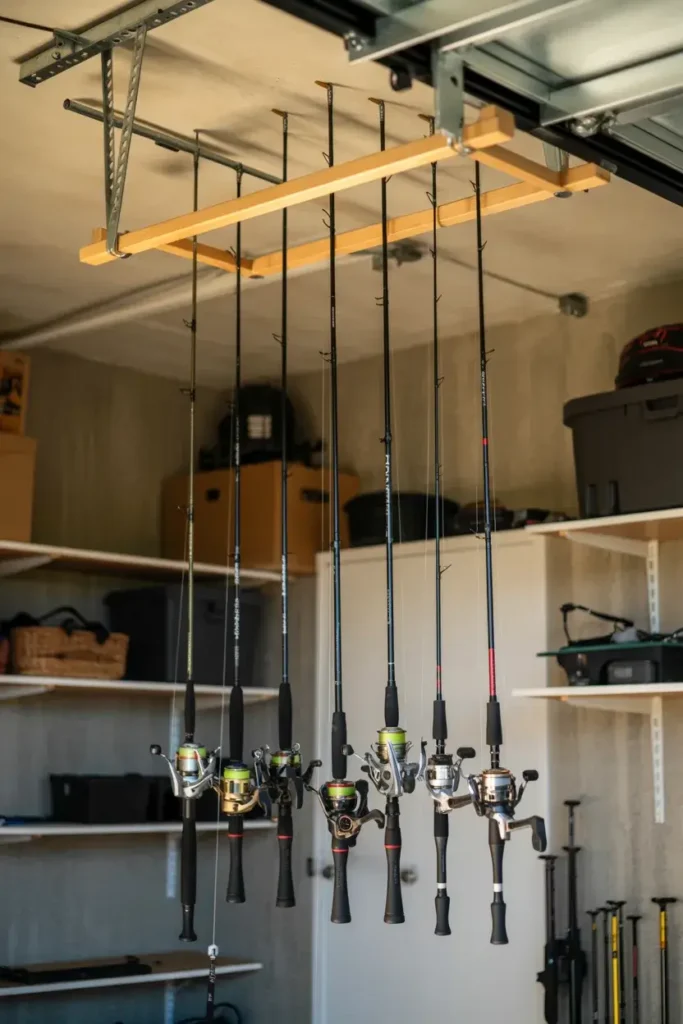 I hate when fishing lines get tangled because the rods are stacked in a corner. I mounted rod holders on the ceiling to keep them safe and organized.