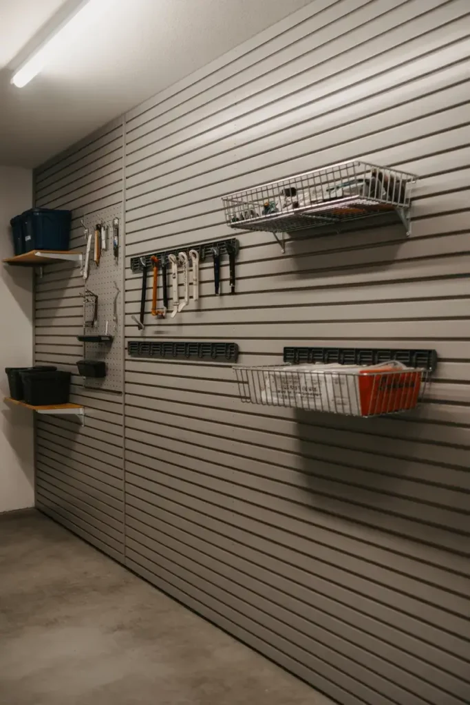 I consider slatwalls the ultimate adaptable storage solution. You install these paneled tracks on your wall, and then you can snap in hooks, baskets, and shelves wherever you need them.